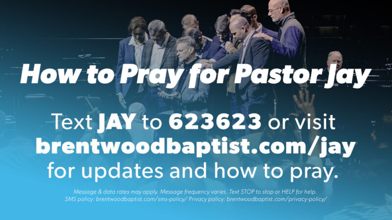 Learn how to pray for Pastor Jay and his family during this season. Stay informed with the latest updates and specific ways to pray by texting JAY to 623623 or visiting brentwoodbaptist.com/jay. Thank you for continuing to lift him up in prayer.